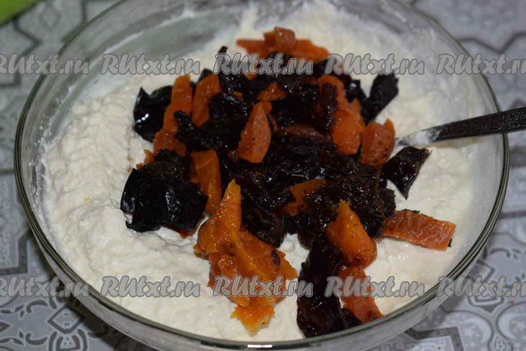 Сухофрукты промоем в горячей воде, сольем жидкость, дадим им обсохнуть. Подсушенные сухофрукты нарежем на кусочки и добавим их к творожной массе, перемешаем.