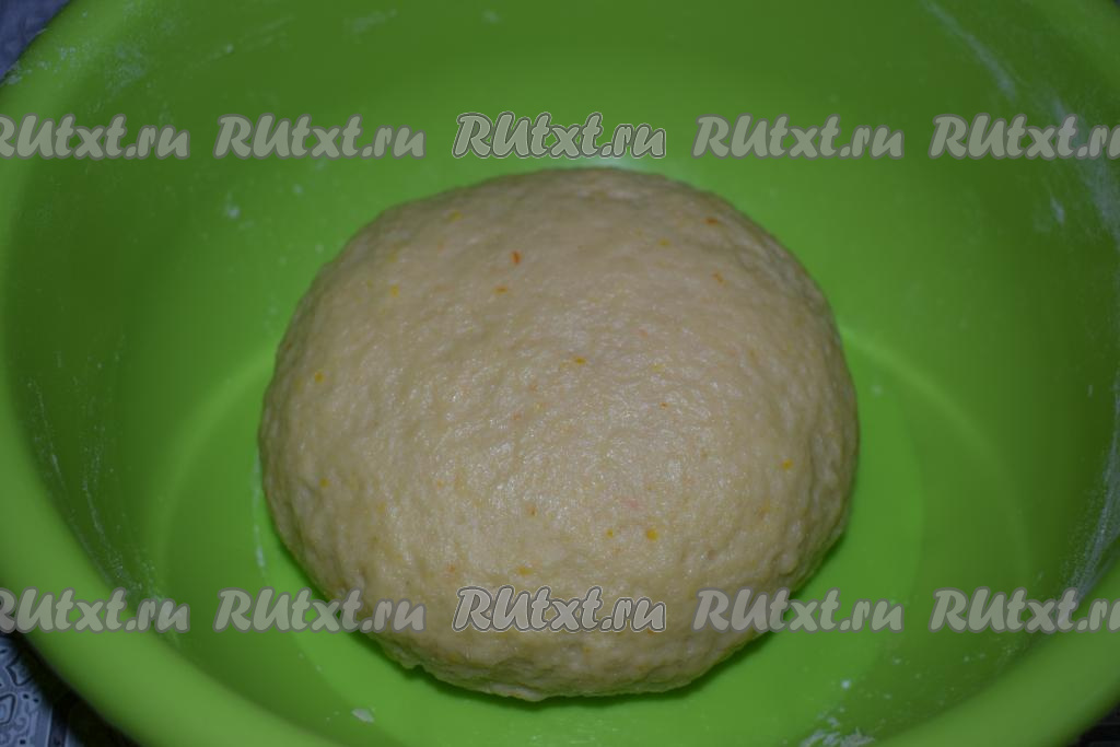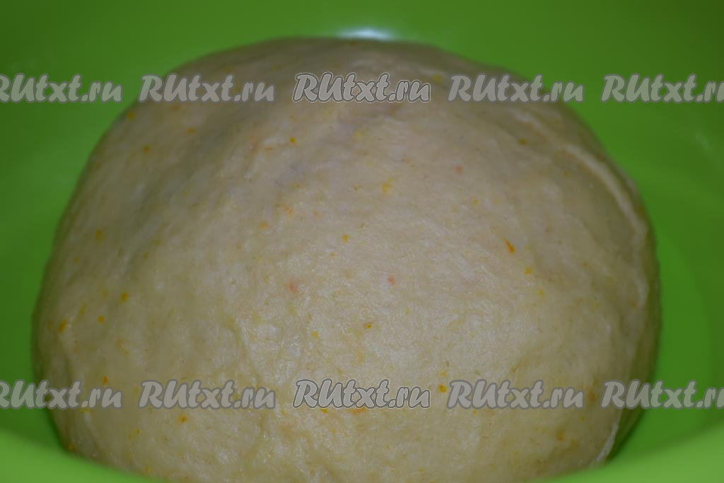 Затем начинаем месить тесто руками. Вымешиваем тесто, примерно, 7-8 минут (до получения гладкого, упругого шара). Накрываем тесто плёнкой и отправляем в тёплое место на расстойку, примерно, на 1 час.