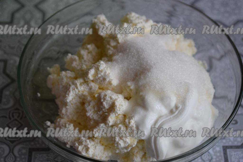В это время приготовим начинку для нашего дрожжевого пирога, для этого смешаем творог с сахаром и ванилином, добавим сметану и ещё раз хорошо перемешаем творожную массу.