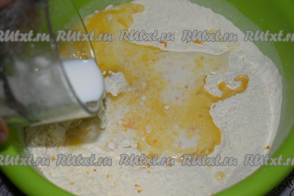 Вольём к тесту тёплое (примерно, 38-40 градусов) молоко и начнём замешивать тесто.
