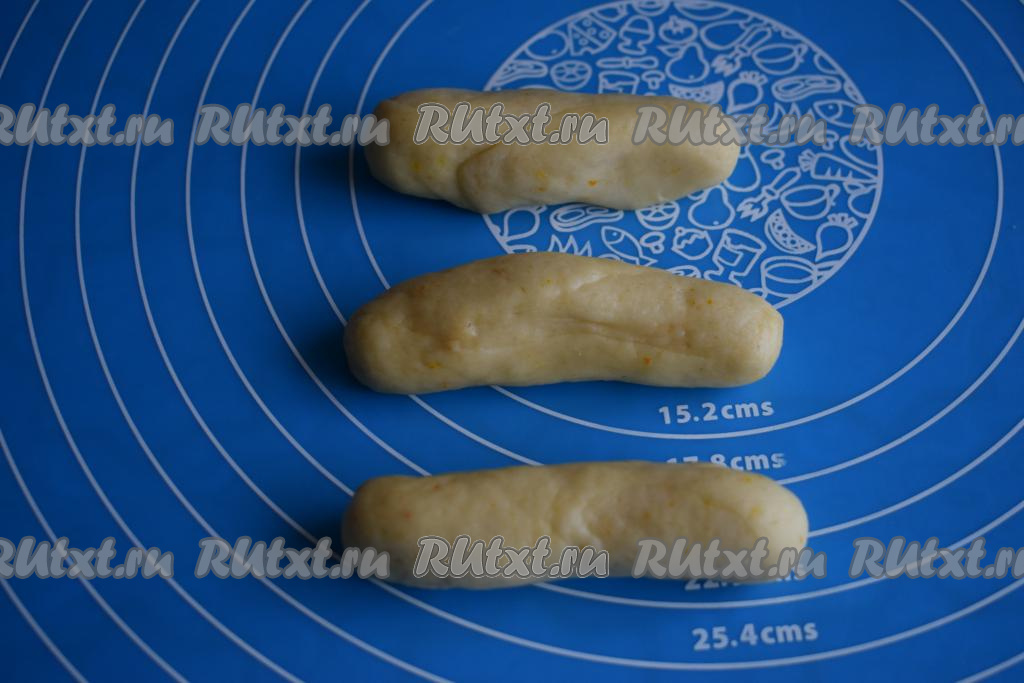 Обминаем каждый кусочек теста и подкатываем их в шарики. Каждый шарик раскатываем в колбаску.