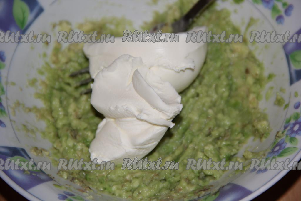 Добавить к мякоти авокадо творожный сыр.