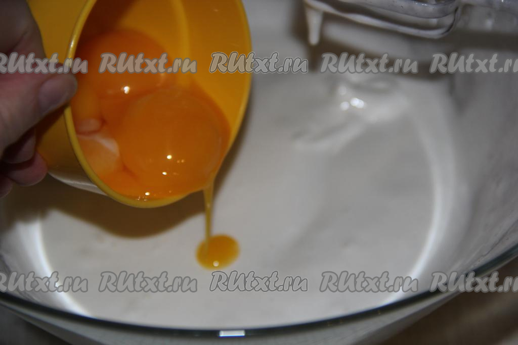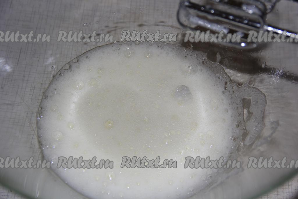 Разделить 4 яйца на белки и желтки. Миксером взбить 4 белка в пышную пену со щепоткой соли.