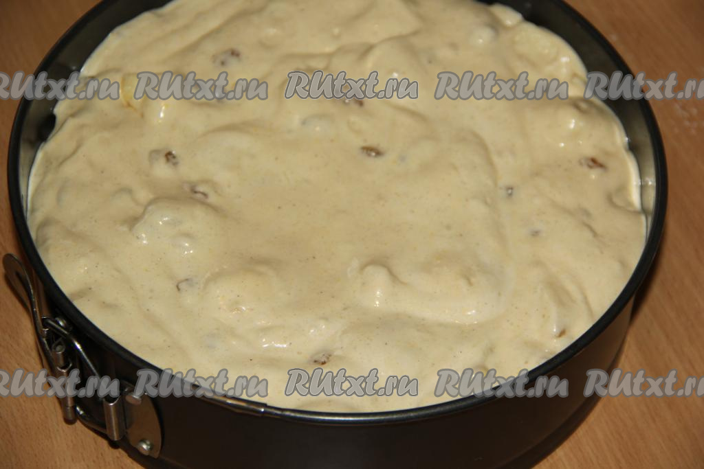 Форму для выпечки (я выпекала в разъёмной форме диаметром 22 см) смазать растительным (или сливочным) маслом и выложить в неё тесто.