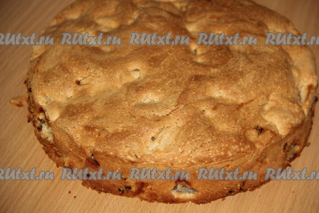 Поставить форму с тестом в духовку, разогретую до 180 градусов. Выпекать шарлотку с яблоками и изюмом минут 35-40. Готовность можно проверить сухой шпажкой (шпажка останется сухой при прокалывании готового пирога). Готовую шарлотку слегка остудить в форме, а затем достать из формы и остудить на решётке.