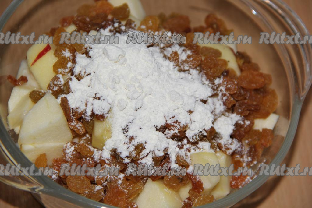 Соединить яблоки и изюм, всыпать 1 столовую ложку крахмала и хорошо перемешать, обволакивая крахмалом все фрукты.