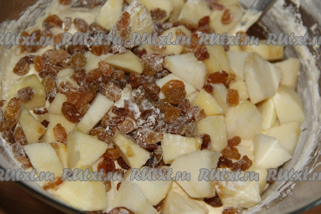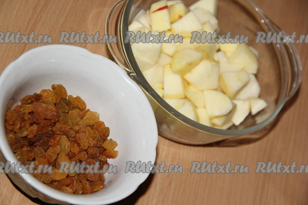 Нарезать яблоки, предварительно очищенные от кожуры и сердцевины, на средние кусочки. Если изюм слишком сухой, его нужно минут на 10 залить кипящей водой, затем воду слить, а изюм обсушить.
