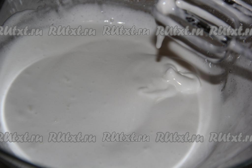 В получившуюся белковую пену добавить сахар и взбивать миксером в течение 5 минут. Сахар должен полностью раствориться, а белковая масса станет блестящей и воздушной.