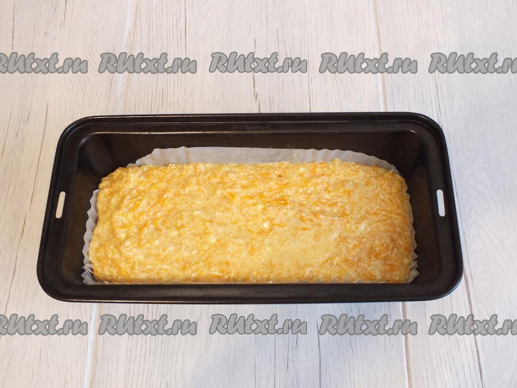Возьмите форму (размер формы в моём случае 20 на 10 см), застелите её пекарской бумагой (или смажьте тонким слоем сливочного масла) и выложите тесто. Поставьте выпекаться тыквенно-лимонный пирог в разогретую до 180 градусов духовку на 40-45 минут (до ровного, жёлтого цвета).