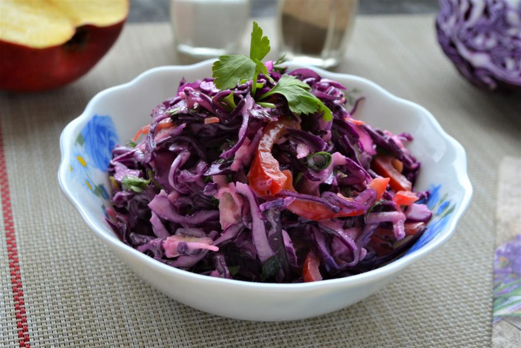 Очень вкусный, полезный салат, приготовленный из краснокочанной капусты с яблоком, выложить в салатник и подать к столу!