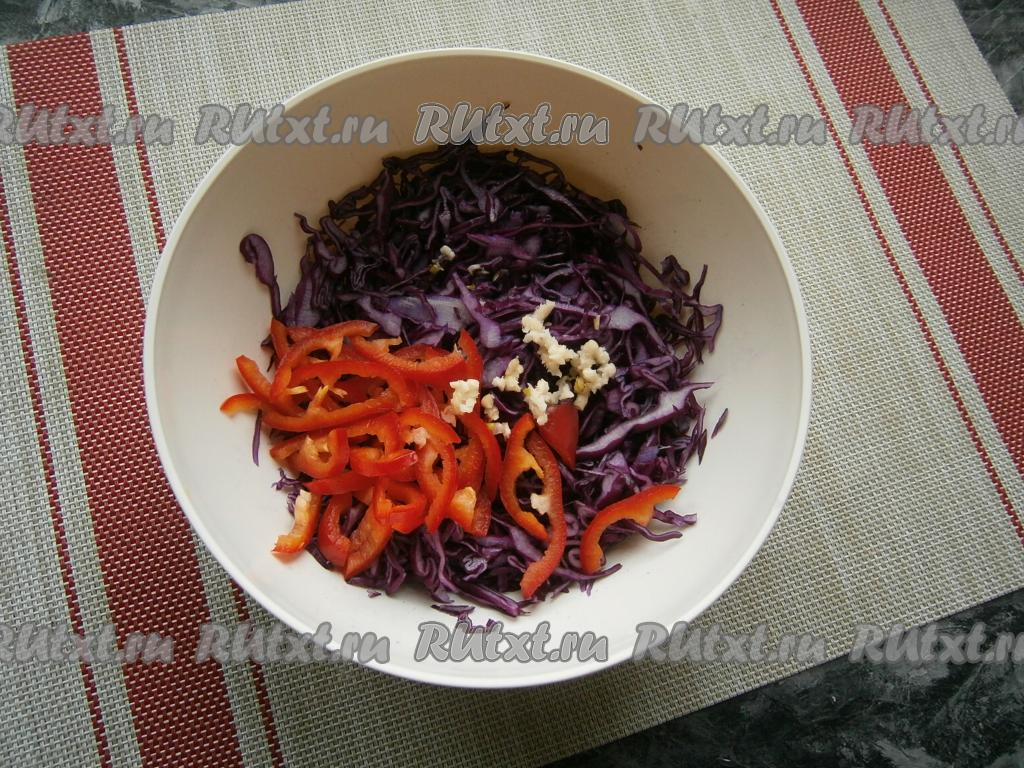Очистить чеснок, удалить из половинки болгарского перца (желательно перец взять красного цвета) семена и плодоножку. Измельчённый чеснок и нарезанный соломкой болгарский перец добавить к нашинкованной краснокочанной капусте.