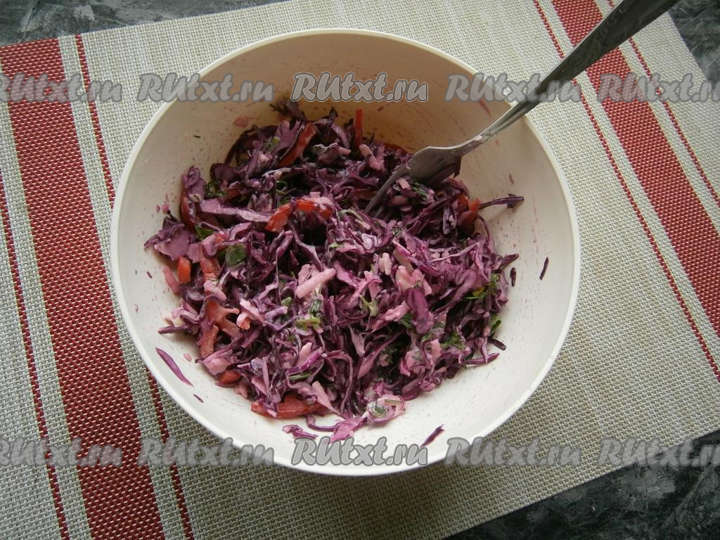 Тонко нашинковать краснокочанную капусту, чуть посолить и помять руками.