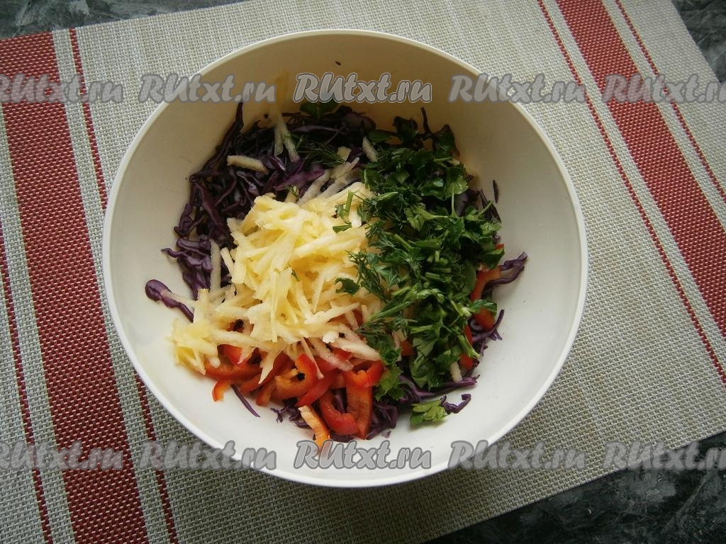 Вымыть и обсушить зелень укропа и петрушки. Натереть на крупной тёрке яблоко, очищенное от кожуры и семян. Чтобы натёртое яблоко не потемнело, сразу сбрызнуть его лимонным соком и вместе с нарезанной зеленью укропа и петрушки добавить в салат с краснокочанной капустой.
