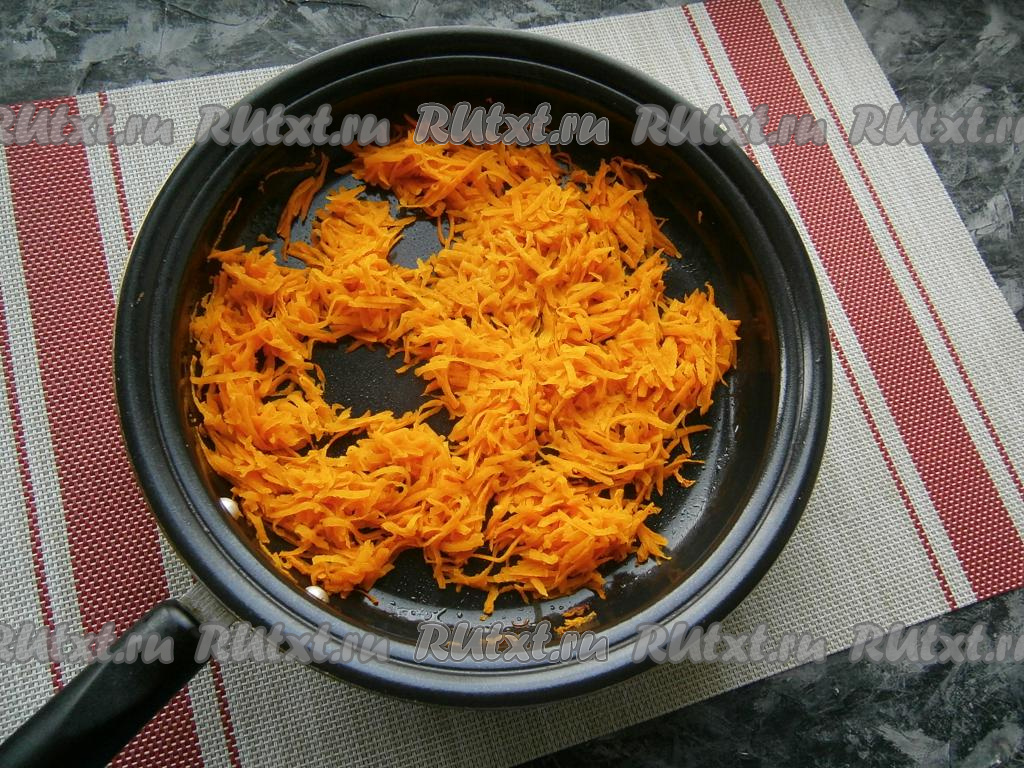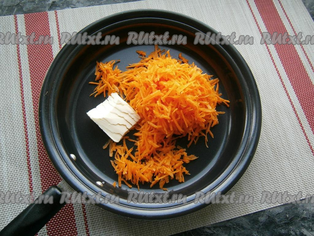 Первым делом подготовить морковь. Для этого морковку очистить, натереть на средней тёрке, выложить в сковороду со сливочным маслом.