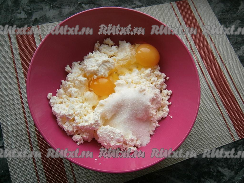 В творог добавить сырые яйца, соль, ванилин и всыпать сахар.