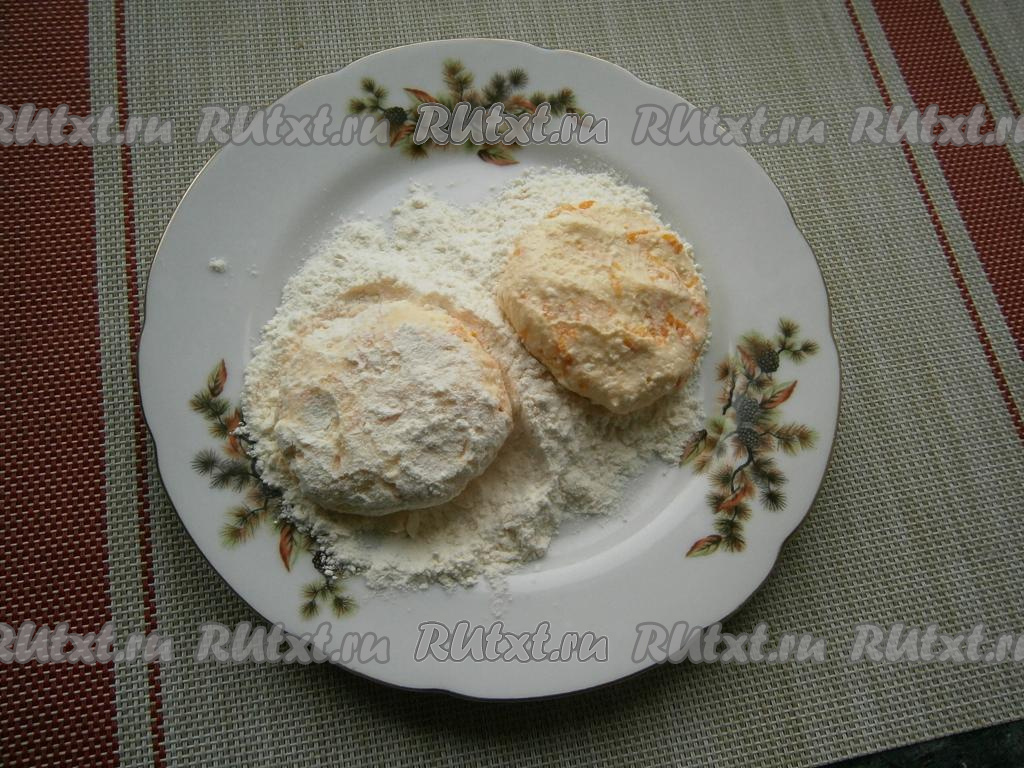 Творожно-морковную массу хорошо перемешать и влажными руками сформировать сырники в виде лепёшек. В отдельную тарелку (или на досочку) насыпать 3 столовые ложки муки, в этой муке обвалять сырники со всех сторон.