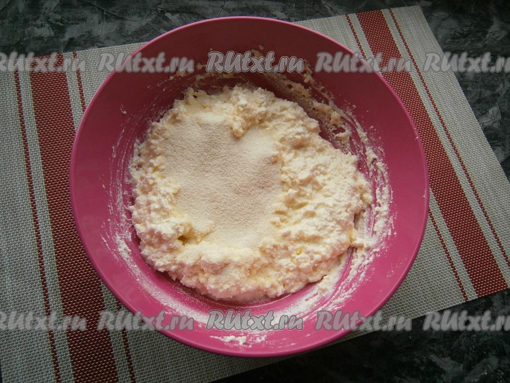 Тщательно перемешать, всыпать манную крупу. Снова творог перемешать и оставить на 15 минут.