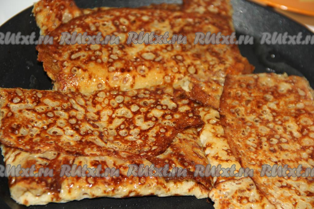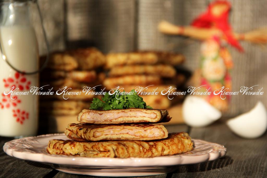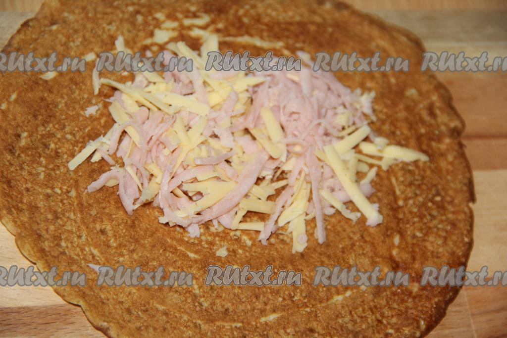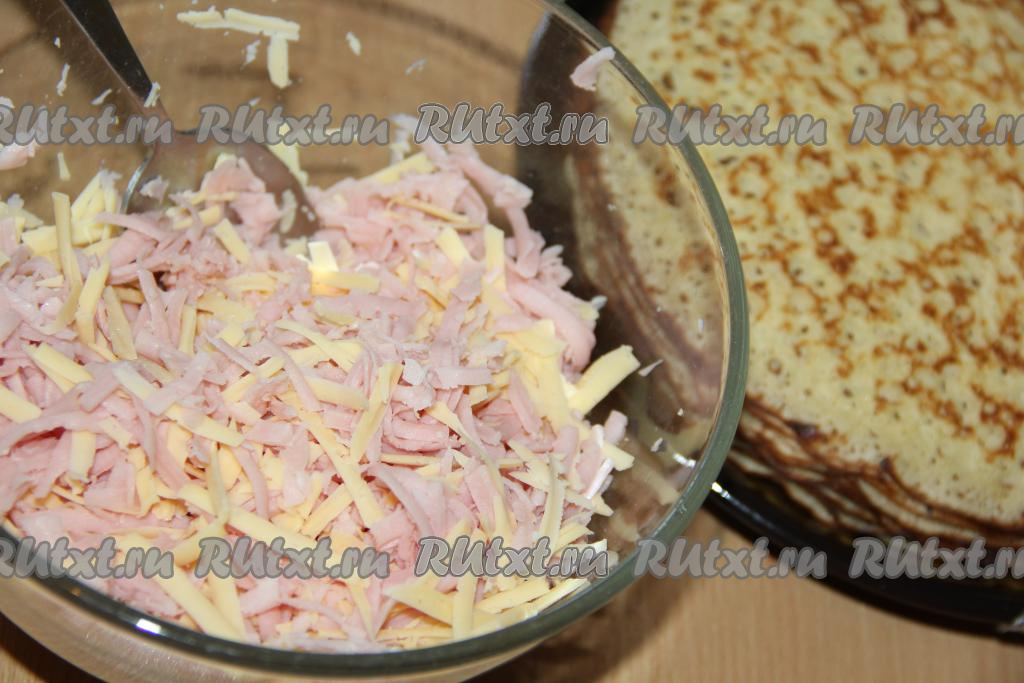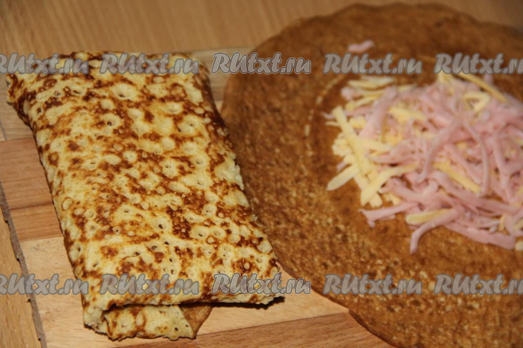 Вкусные, сытные и очень аппетитные блины, фаршированные колбасой и сыром, сразу подать к столу. Блинчики получаются отличными, попробуйте!