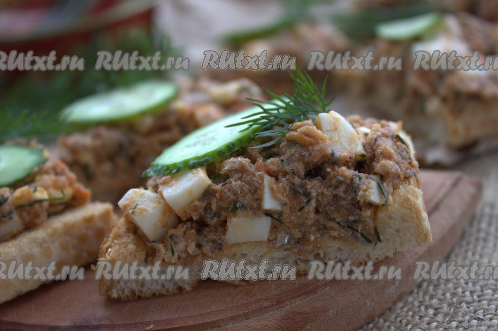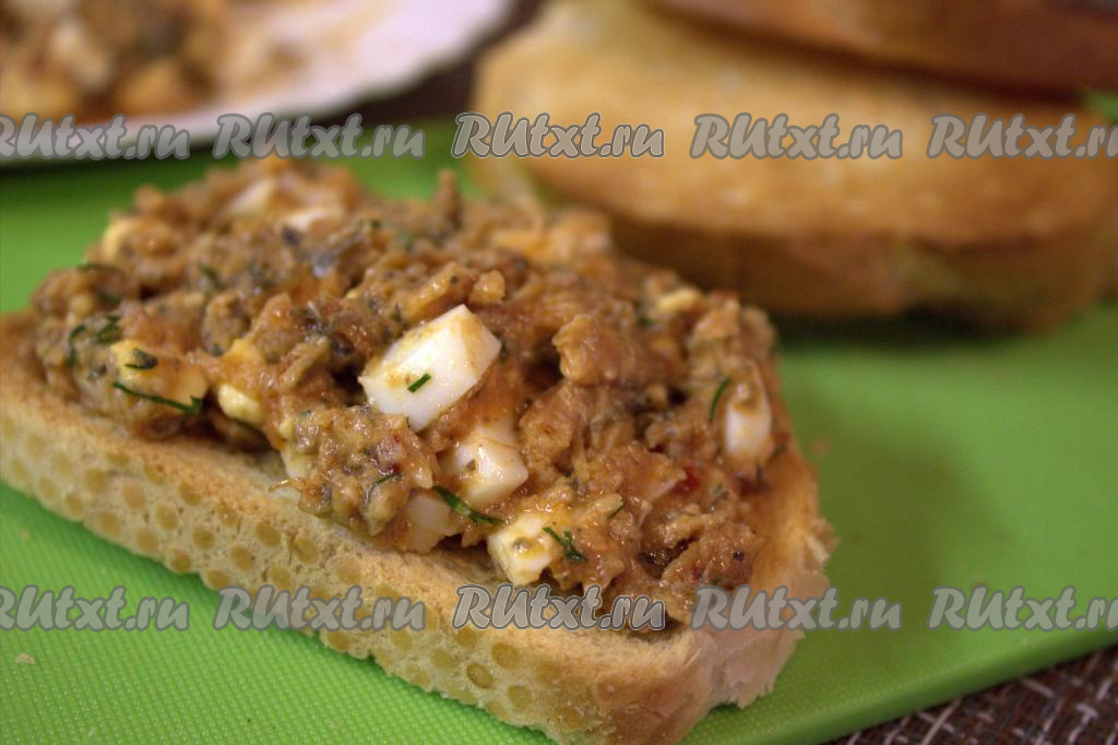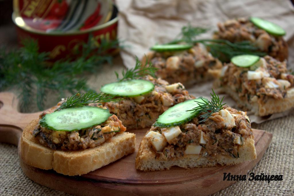 На каждый ломтик подсушенного батона выложить по 1-2 чайных ложки получившейся массы. При желании, бутерброды с килькой в томате можно разрезать пополам.