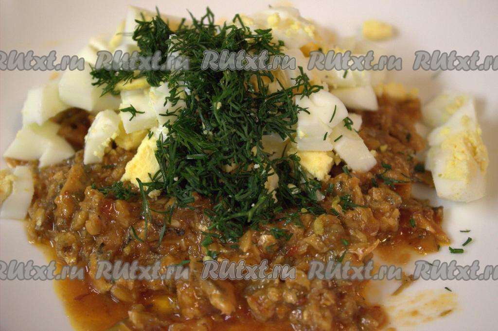 В миске соединить рыбные консервы, измельчённые яйца и мелко порубленную зелень (несколько веточек зелени оставьте для украшения бутербродов). По желанию, можно добавить измельчённый чеснок или перчик чили (я не добавляла, у меня килька в томате была с добавлением перца чили).