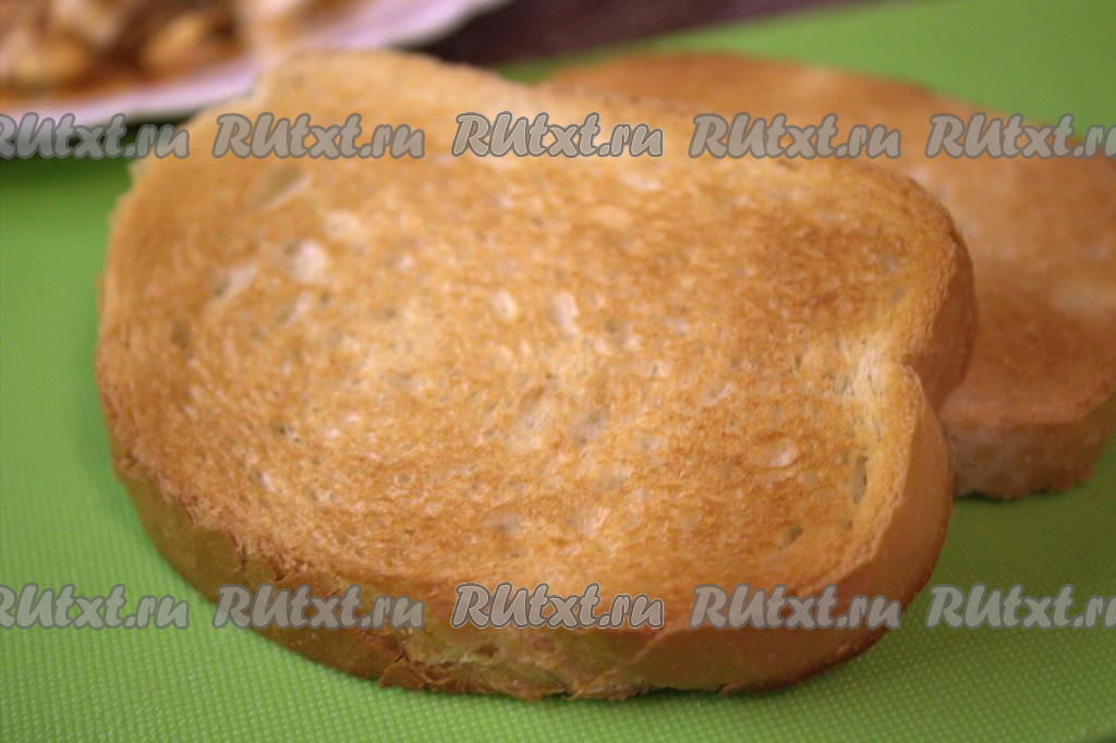 Нарезать на ломтики батон (или белый хлеб), выложить на сухую сковороду и подсушить на среднем огне до золотистого цвета с двух сторон (я подсушила ломтики хлеба в тостере).