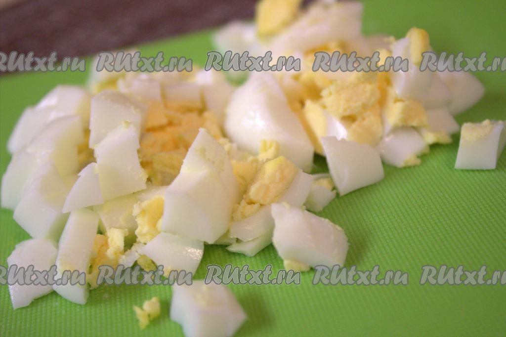 Яйца отварить вкрутую (варить с момента закипания 10 минут), охладить, почистить и нарезать мелкими кубиками.