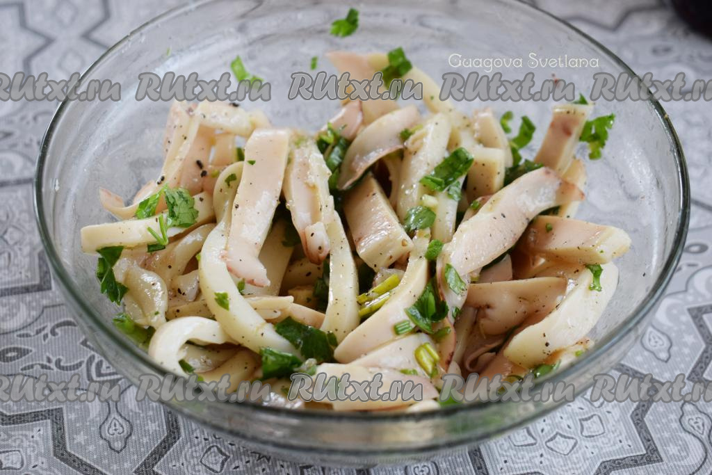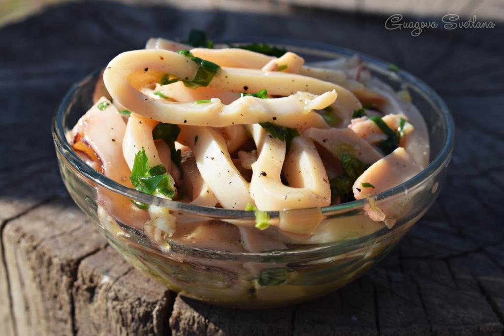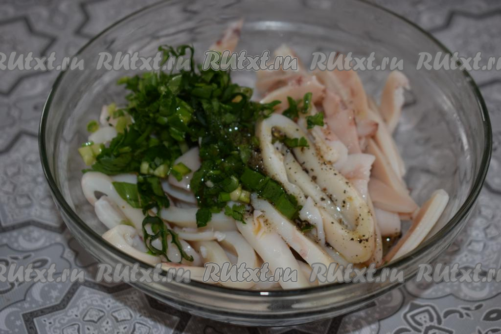 Выливаем маринад в миску с кальмарами и зеленью, тщательно перемешиваем.