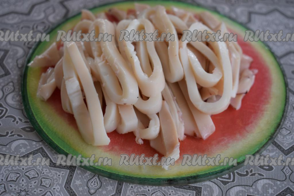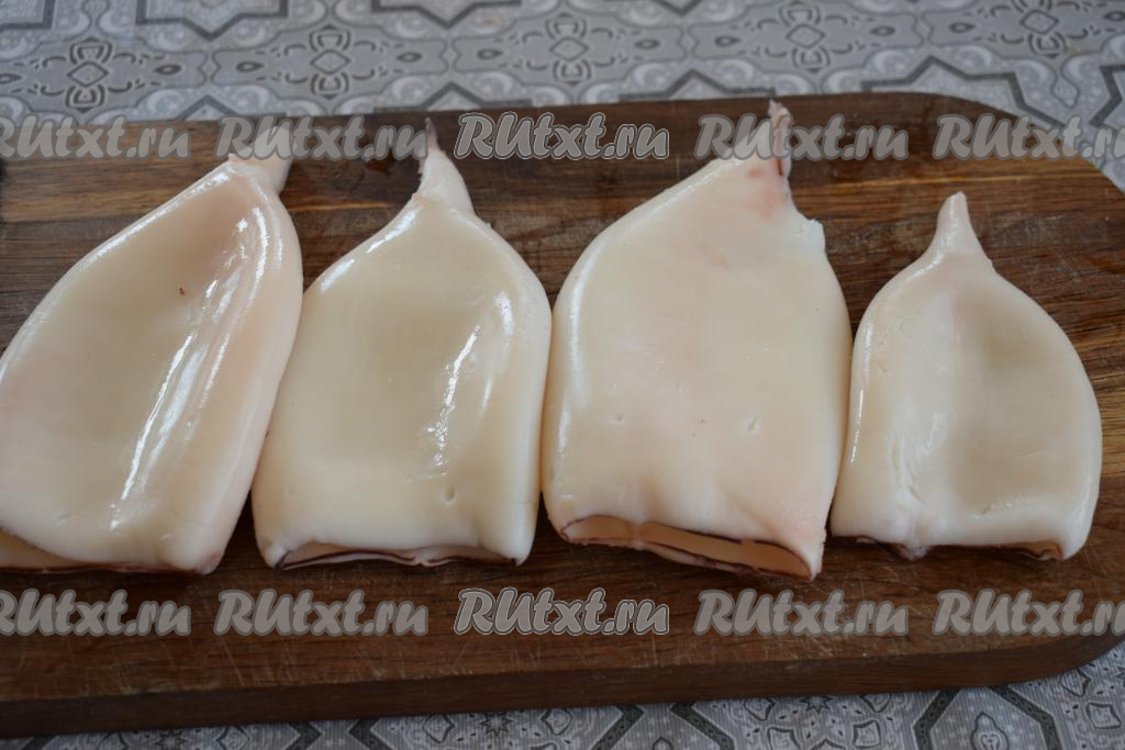 Кальмаров размораживаем, удаляем внутренности и хорду, а затем отвариваем в кипящей воде в течение 2 минут. Отваренных кальмаров промываем под холодной водой, а затем очищаем от плёнки.
