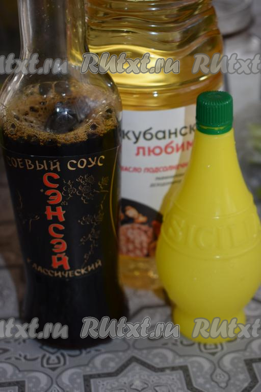 Отправляем нарезанную зелень к кальмарам. Далее подготовим маринад, для этого в миске смешиваем масло растительное, соевый соус, сок лимона, уксус, соль, сахар и чёрный молотый перец.