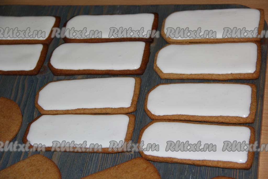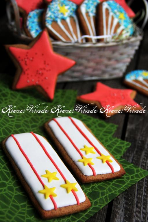 Приготовленной глазурью, выложенной в кулинарный мешок, можно украсить печенье, исходя из вашей фантазии. Я для украшения печенья к 23 февраля использовала глазурь белого и красного цветов. Для этого часть приготовленной глазури я отложила, добавила в неё красный гелевый краситель и перемешала до однородности. Белую глазурь я выложила в кулинарный мешок. Я сначала покрыла погоны белой глазурью и дала глазури подсохнуть в течение 1 часа, а затем нанесла полоски из красной глазури и "приклеила" звёзды на погоны (звёзды сделала из мастики). Для того чтобы белая глазурь легла равномерно на печенье, я вначале рисую контур, оставляю минут на 10-15, а затем уже заполняю внутри всё пространство глазурью.