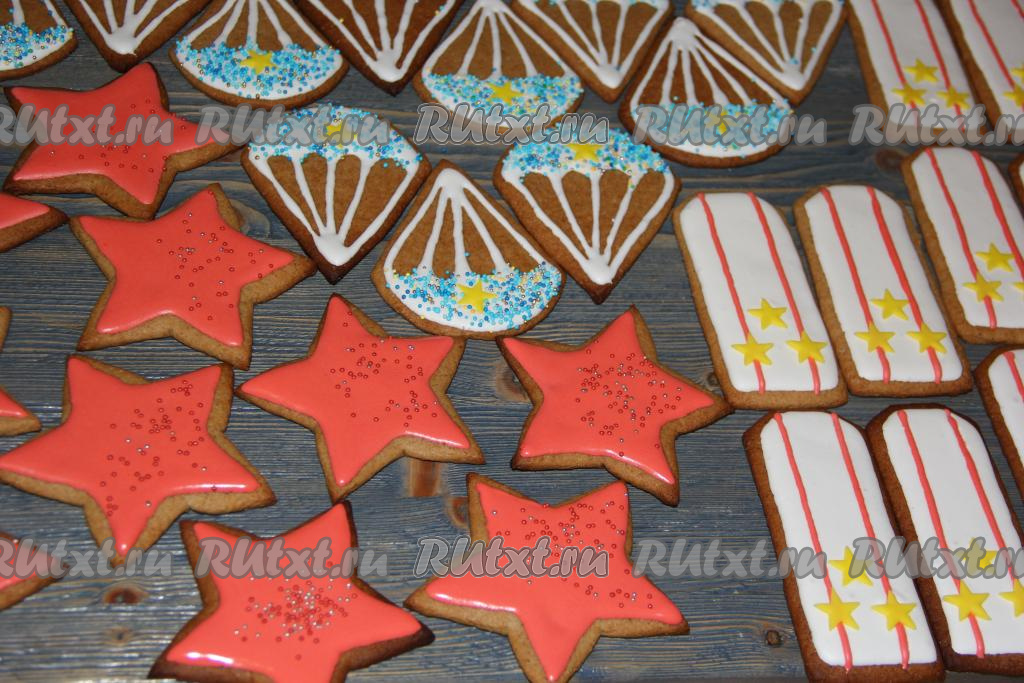 Звёзды покрыла красной глазурью, а парашюты сделала цветными, украсив кондитерской посыпкой. Оставить печенье на сутки до полного высыхания глазури.