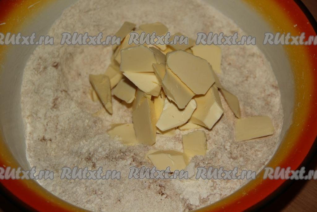 Слегка перемешать сухие ингредиенты. Размягчённое сливочное масло порубить ножом и выложить в миску с сухими ингредиентами.