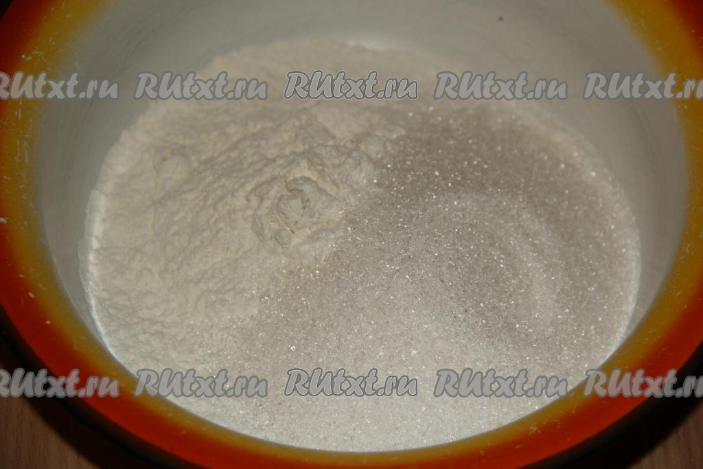 Сливочному маслу дать полежать при комнатной температуре, чтобы оно стало мягким. В достаточно большой миске соединить сахар, соль и муку. Муку желательно предварительно просеять.