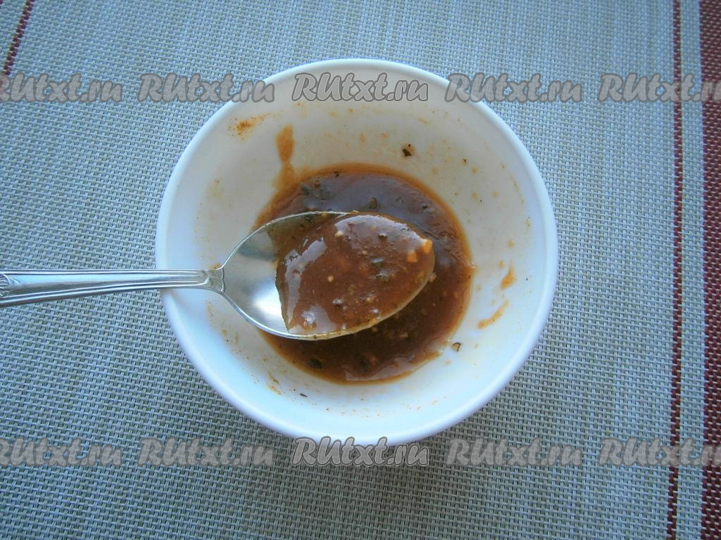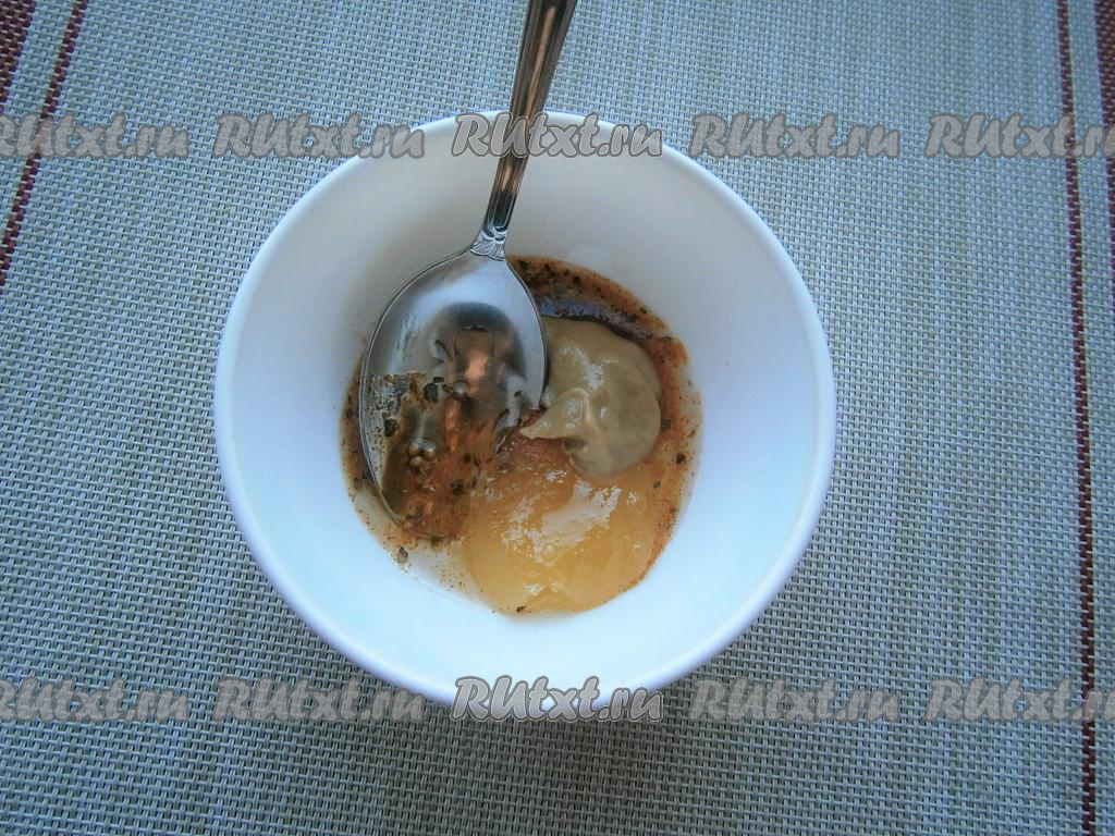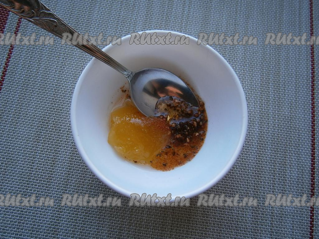 Приготовить соус: к растительному маслу добавить сок лимона, приправу для мяса и мёд.