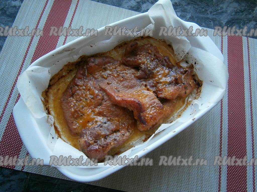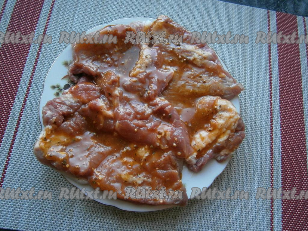 Ломти мяса немного отбить молоточком, посолить и щедро смазать медово-горчичным соусом со всех сторон. Оставить свинину для маринования на 1 час при комнатной температуре.