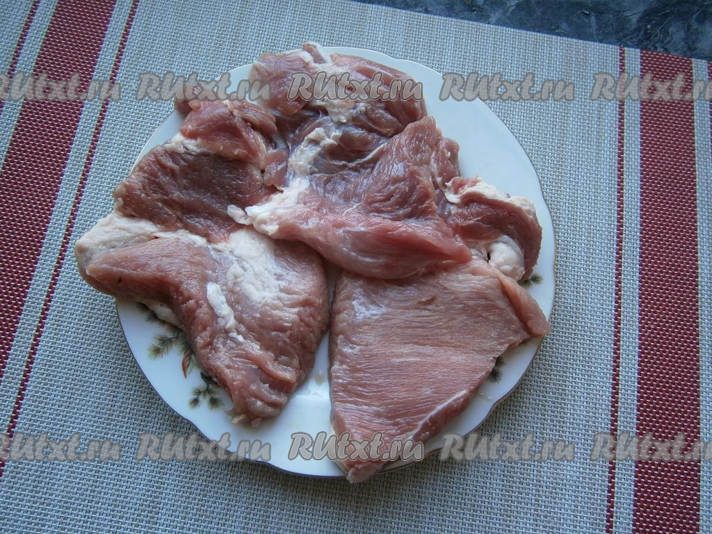 Мякоть свинины разрезать на плоские большие ломти (как для отбивных).