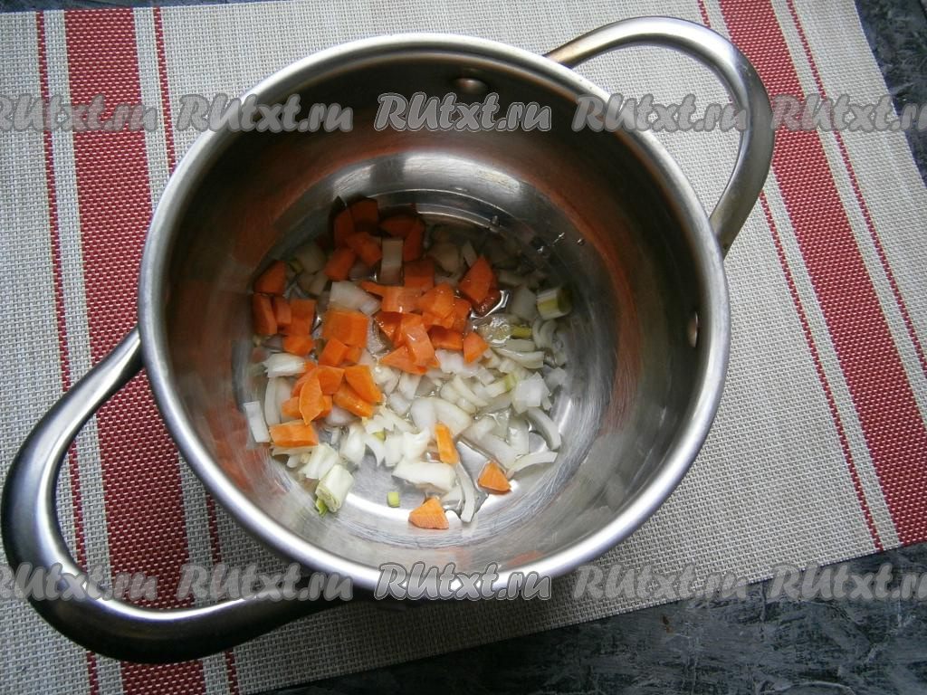 Лук, картофель и морковь очистить. Шампиньоны вымыть. Влить в толстостенную кастрюлю растительное масло, выложить морковь, нарезанную на небольшие кубики, и нарезанный кусочками лук.