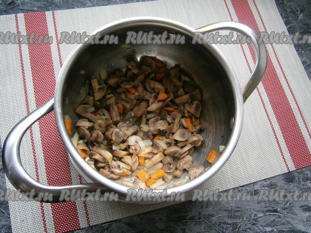 Перемешать шампиньоны с морковкой и луком и обжаривать в кастрюле, помешивая, на небольшом огне до тех пор, пока грибы не начнут поджариваться (3-5 минут).