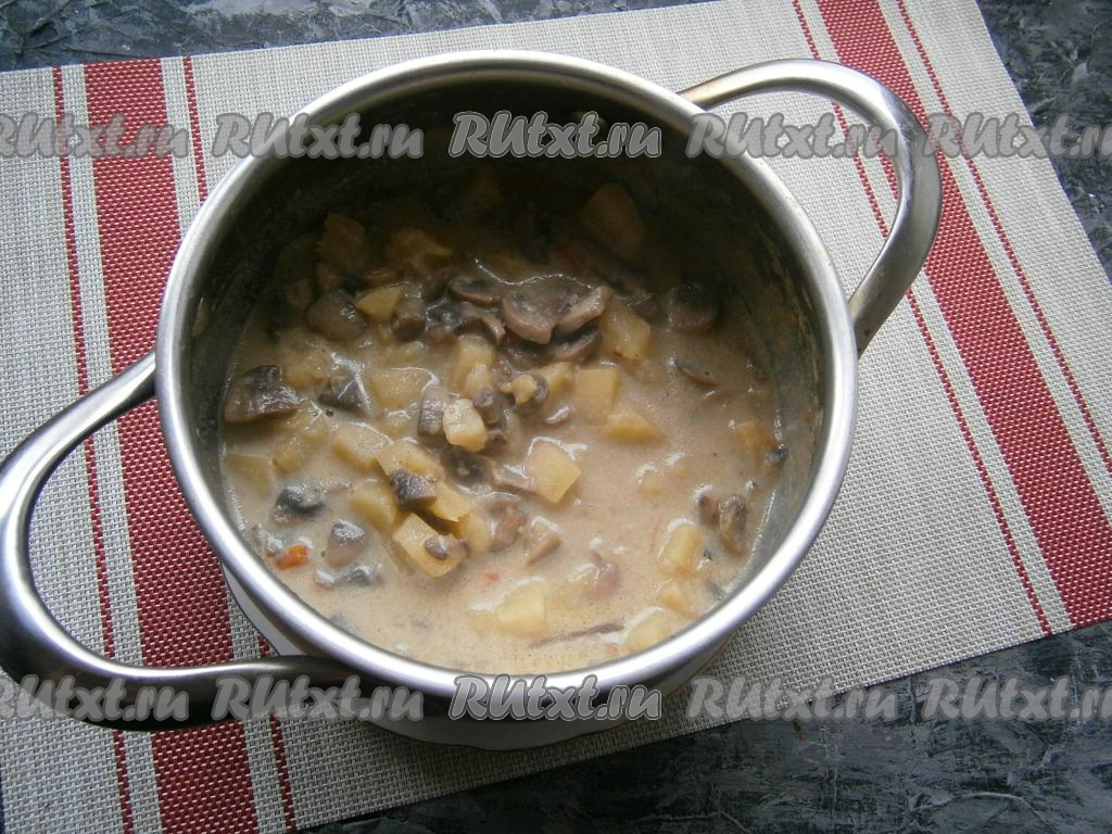 Влить оставшиеся 50 мл сливок, суп перемешать и довести до кипения на небольшом огне, помешивая. Если суп вам покажется густоватым, разведите его чуть большим количеством сливок или влейте немного горячей воды. Очень вкусный, ароматный, бархатистый суп-пюре, приготовленный из шампиньонов со сливками и картофелем, разлить по тарелкам, посыпать небольшим количеством чёрного молотого перца и измельчённой зеленью, добавить сверху кусочек сливочного масла и подать к столу в горячем виде.