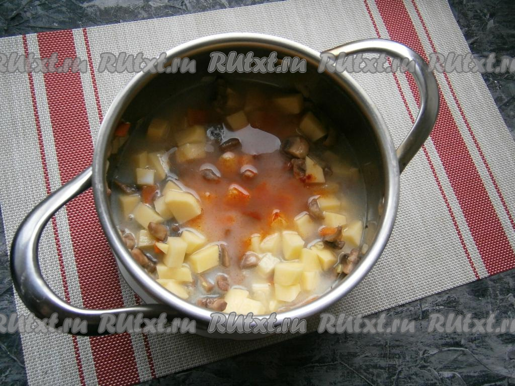 Добавить в кастрюлю шампиньоны, нарезанные на небольшие кусочки (или пластины).