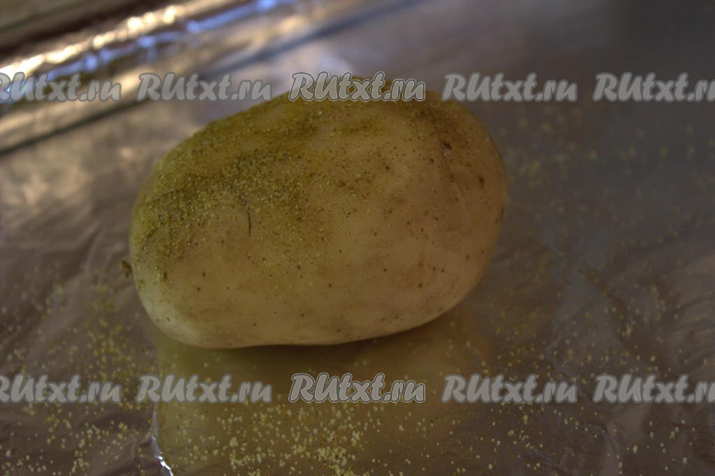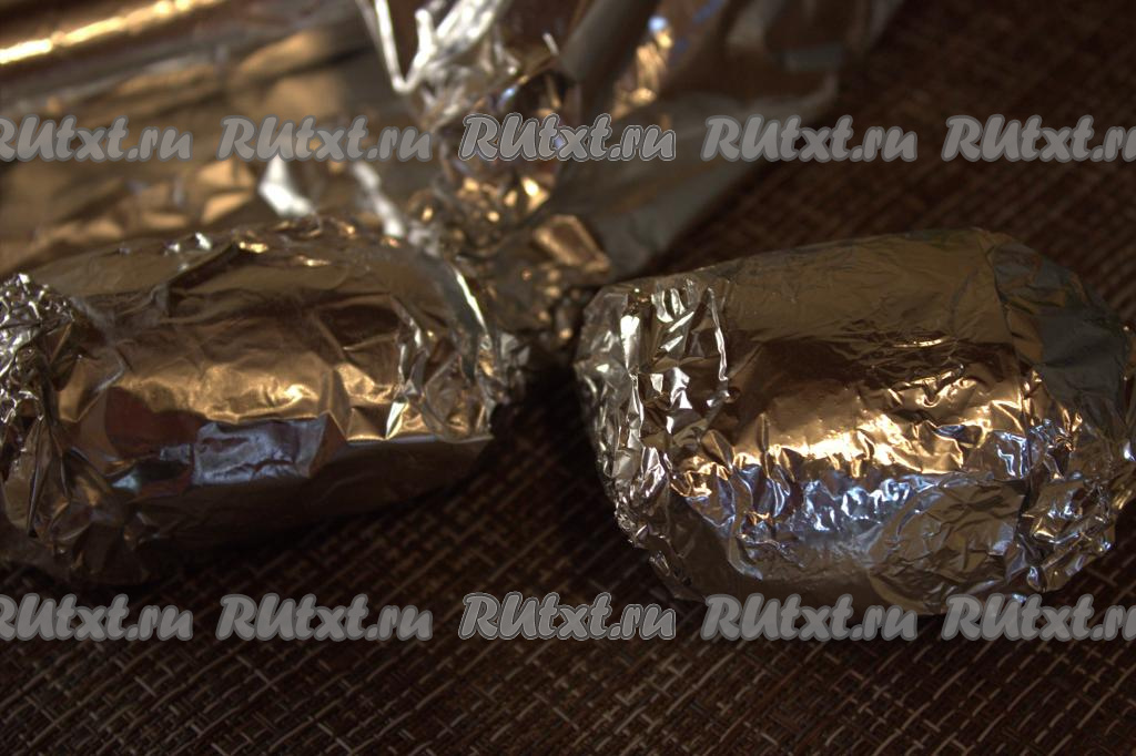 Каждую картофелину по отдельности завернуть в фольгу, выложить на противень и отправить запекаться в разогретую до 180 градусов духовку на 40-50 минут (время запекания зависит от размера картошки). Готовность картошки проверить при помощи вилки или ножа (готовый картофель легко прокалывается).