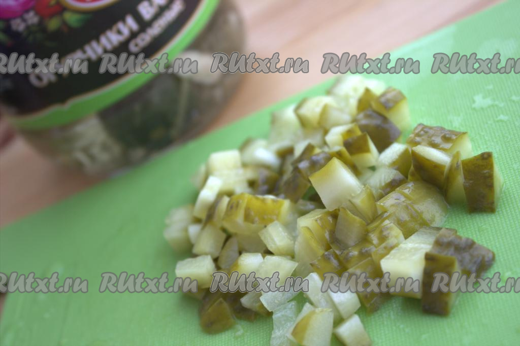 Нарезать на кубики среднего размера солёные огурцы.
