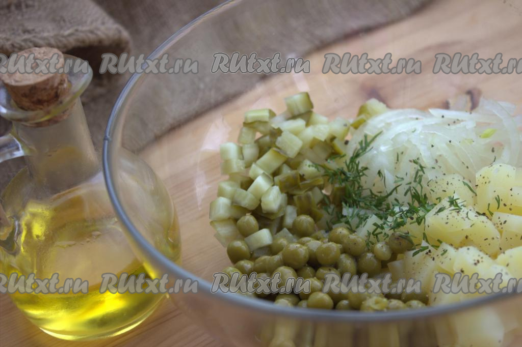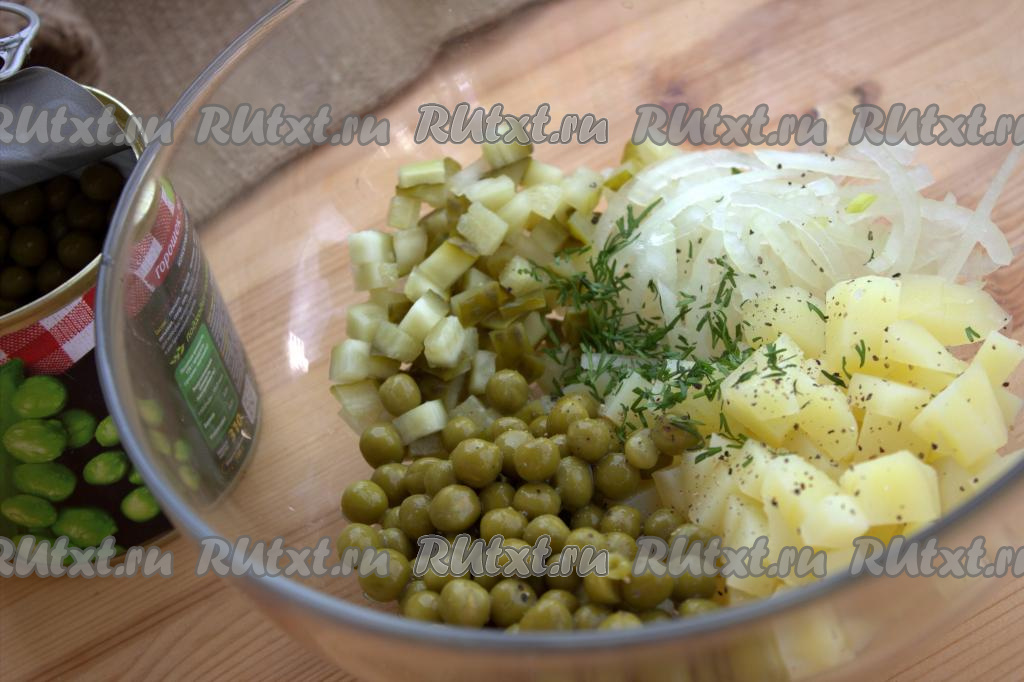 В глубокой миске соединить нарезанные лук, картофель и солёные огурцы. Добавить в миску с салатом 3-4 столовые ложки консервированного горошка без жидкости, рубленную зелень (по желанию), по вкусу чёрный молотый перец и соль.