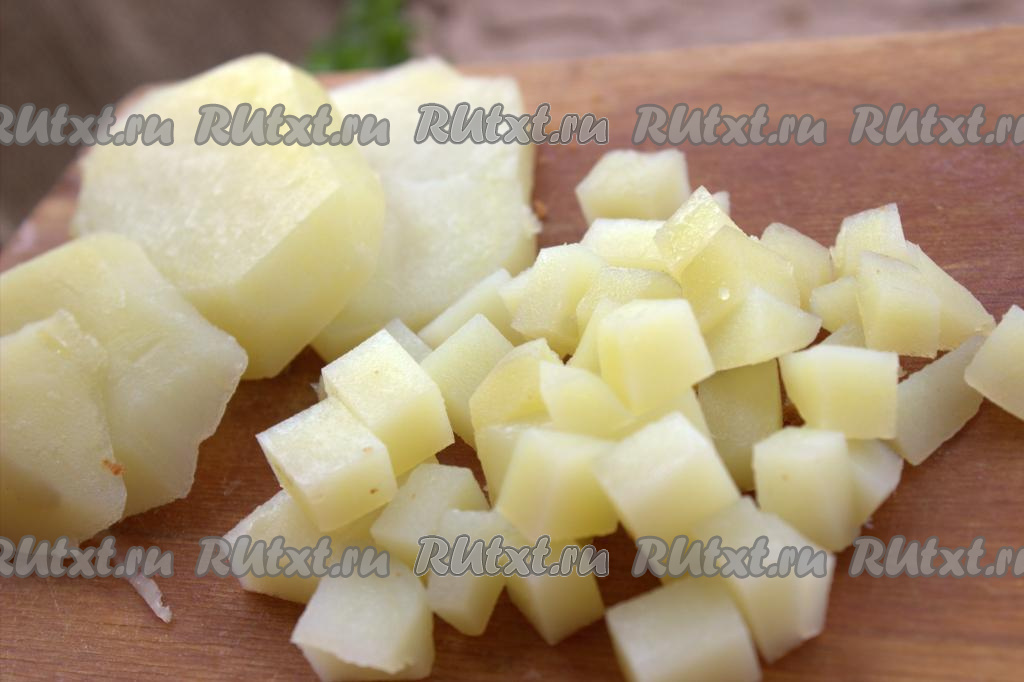 Запечённый картофель остудить, очистить и нарезать на кубики среднего размера.