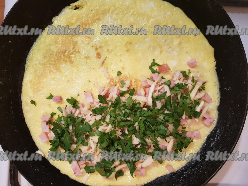Далее выложить яичницу на сковороду (лаваш должен быть снизу). На половине яичницы равномерно распределить нарезанную небольшими кубиками колбасу, натёртый сыр и мелко нарезанную петрушку.