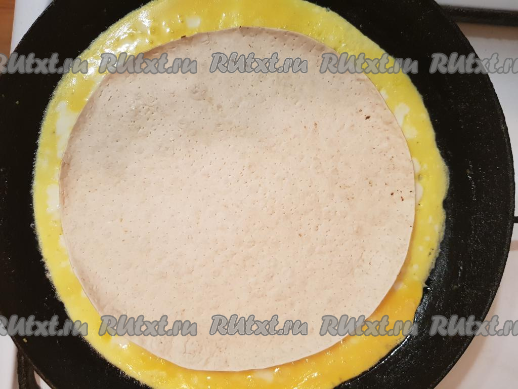 Когда яичница хорошо "схватится" (на её поверхности не будет жидких участков), выложите по середине лист лаваша круглой формы (у меня диаметр лаваша 20 см). Я использовала круглый лаваш, если у вас лаваш другой формы, то придайте ему нужную форму, приложив к нему тарелку нужного диаметра и обрезав по краю тарелки.