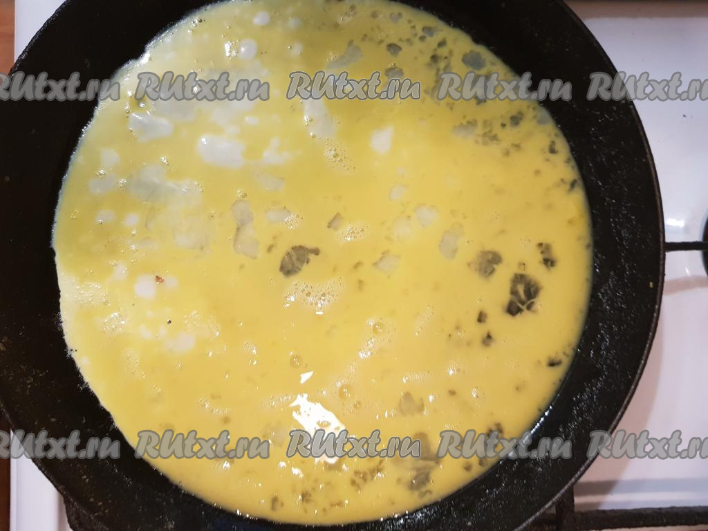 Разогреть сковороду со сливочным маслом и влить яйца, равномерно распределив по сковороде.