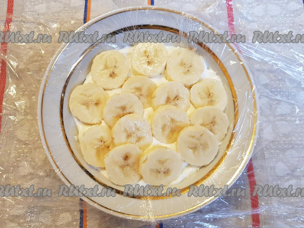 Перевернуть торт из пряников и бананов со сметаной на плоское блюдо, убрать пищевую плёнку.