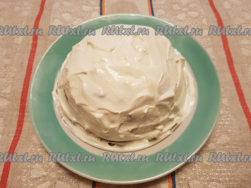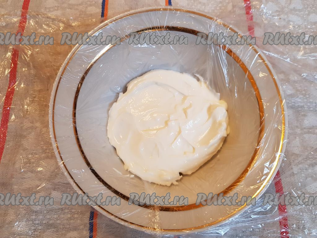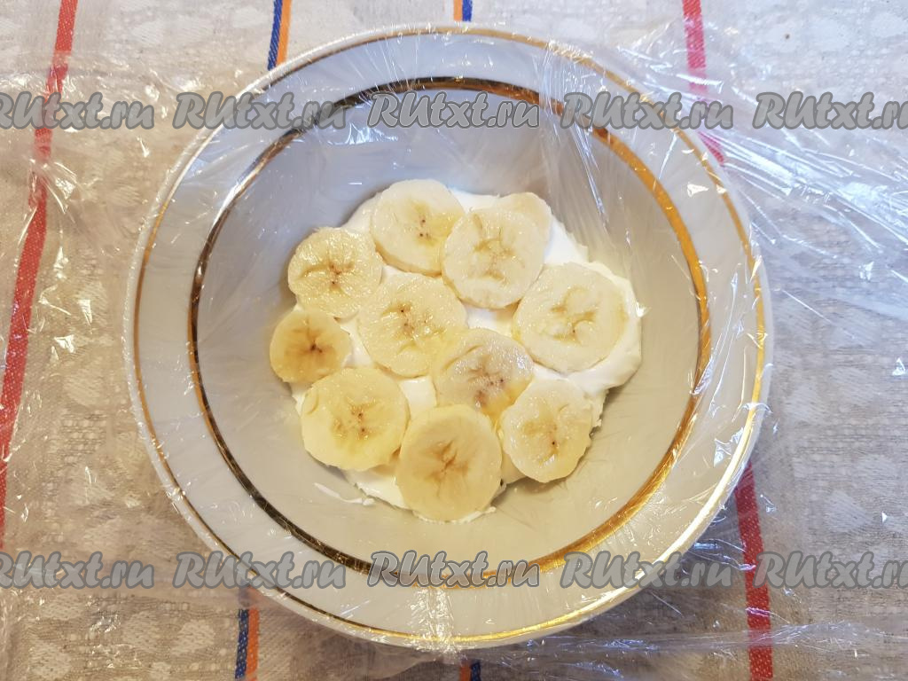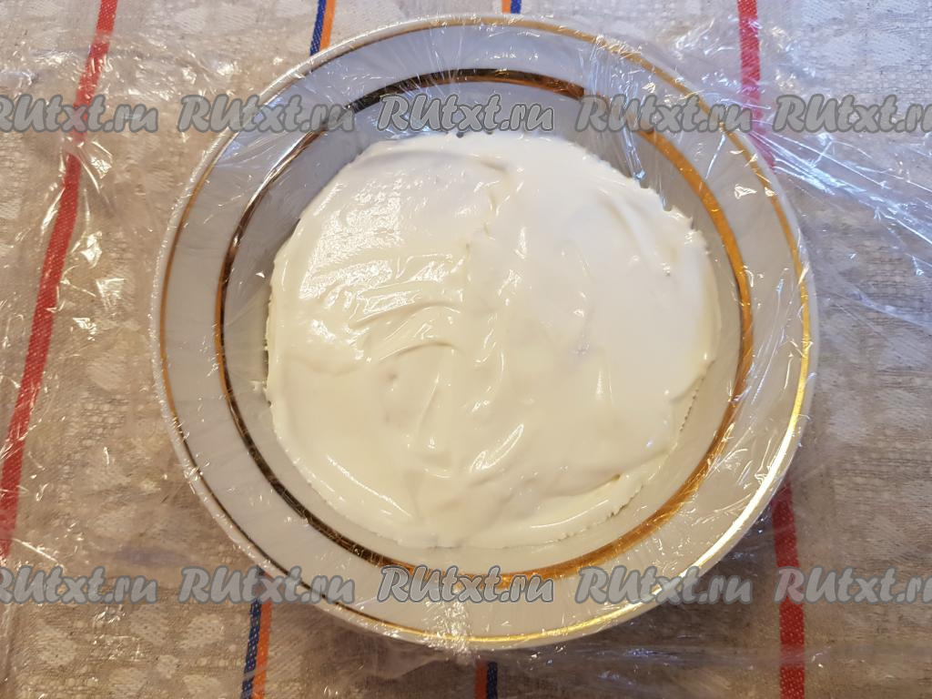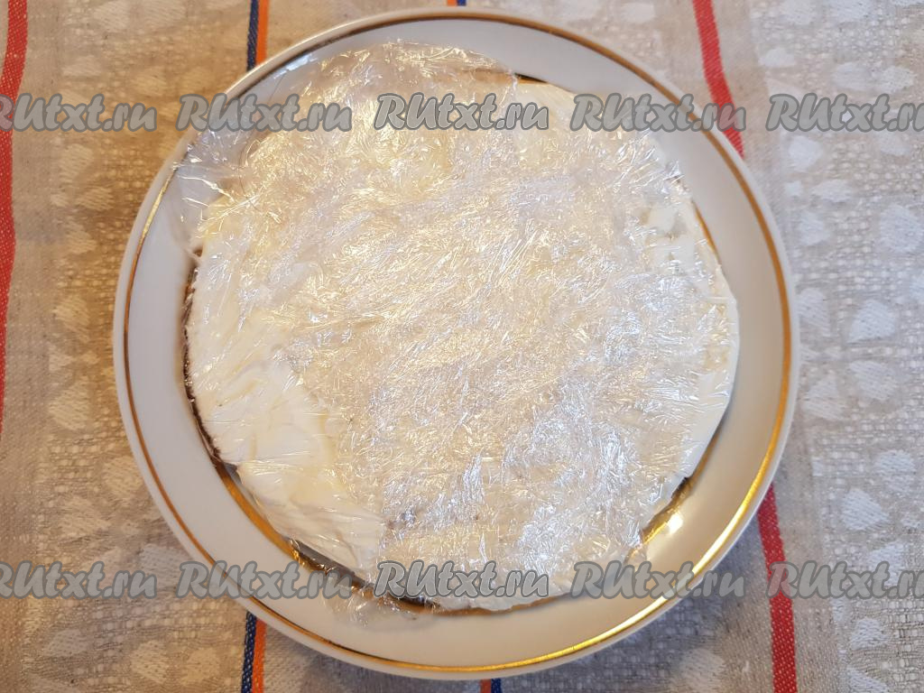 Аккуратно сверху накрыть сметану пищевой плёнкой и поставить торт пропитываться в холодильник на 4-5 часов (желательно оставить на ночь).