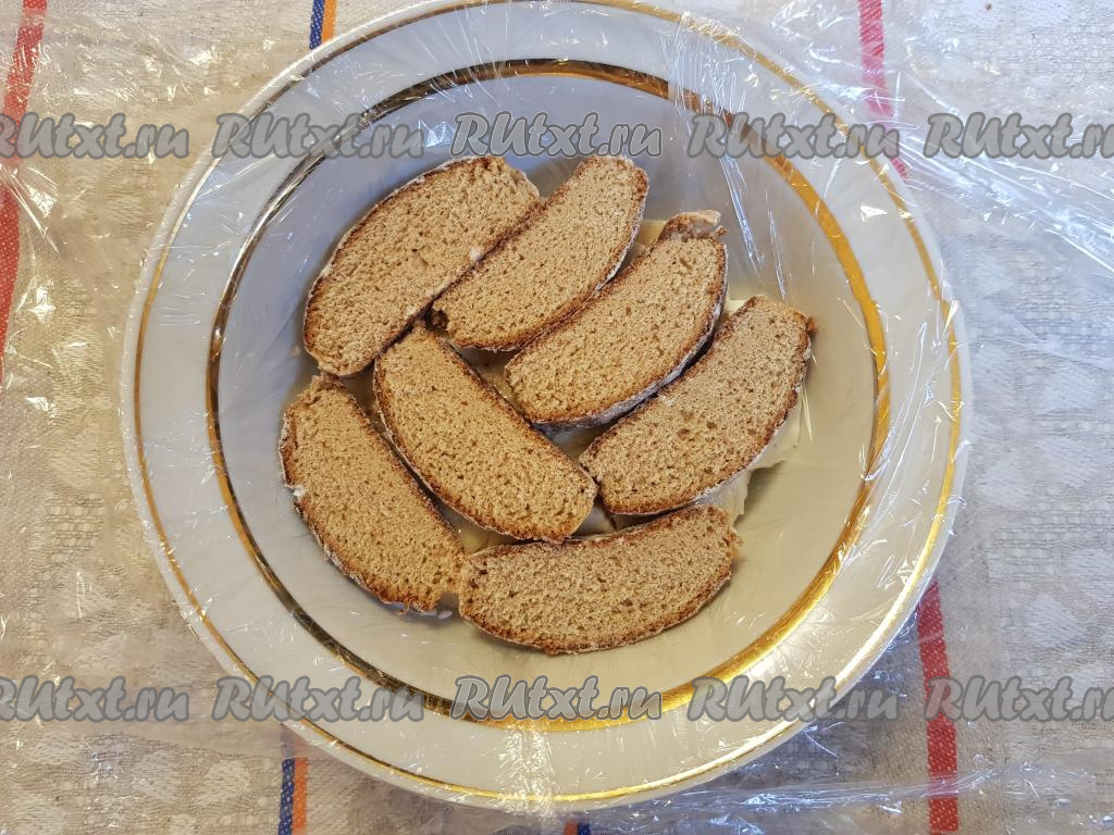Далее приступим к сборке торта. Глубокую тарелку, в которой будем формировать торт, застелить пищевой плёнкой (у меня тарелка расширяется кверху, поэтому её диаметр 8-14 см, а высота, примерно, 5,5 см). Затем выложить слой пряников.